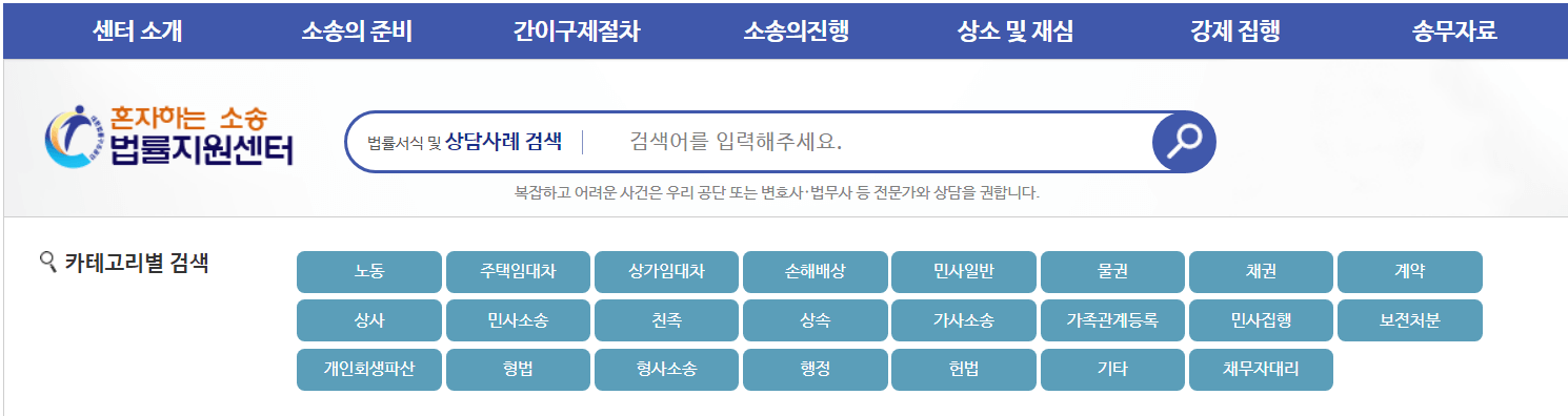 하지만 법에 대해 잘 모르는 일반인이 생소한 법률 용어와 서식들을 알아보기엔 너무 막막할 수 있습니다. 이러한 경우를 돕기 위해 대한법률구조공단에서는 '혼자하는 소송 법률지원센터' 홈페이지를 구축하여 도움을 주고 있는데요, 오늘은 큰 도움이 될 수있는 사이트 '혼자하는 소송 법률지원센터' 를 소개하고 이용방법을 알려드리겠습니다.