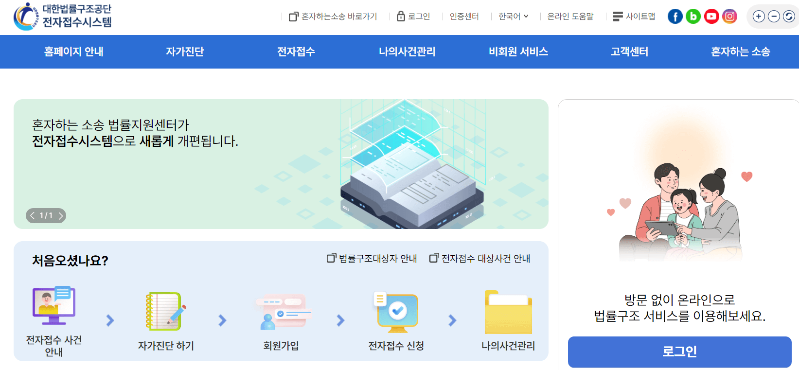 대한법률구조공단에서는 공단에 방문하지 않고 비대면으로 소송을 진행할 수 있도록 전자소송시스템을 운영하고 있습니다. 전자소송시스템 홈페이지에 가시면 전자접수 신청이 가능한 사건인지 자가진단을 해볼 수 있습니다. 전자접수 신청이 가능한 사건인지 확인하고 회원 가입 후 전자접수를 신청하면 됩니다.