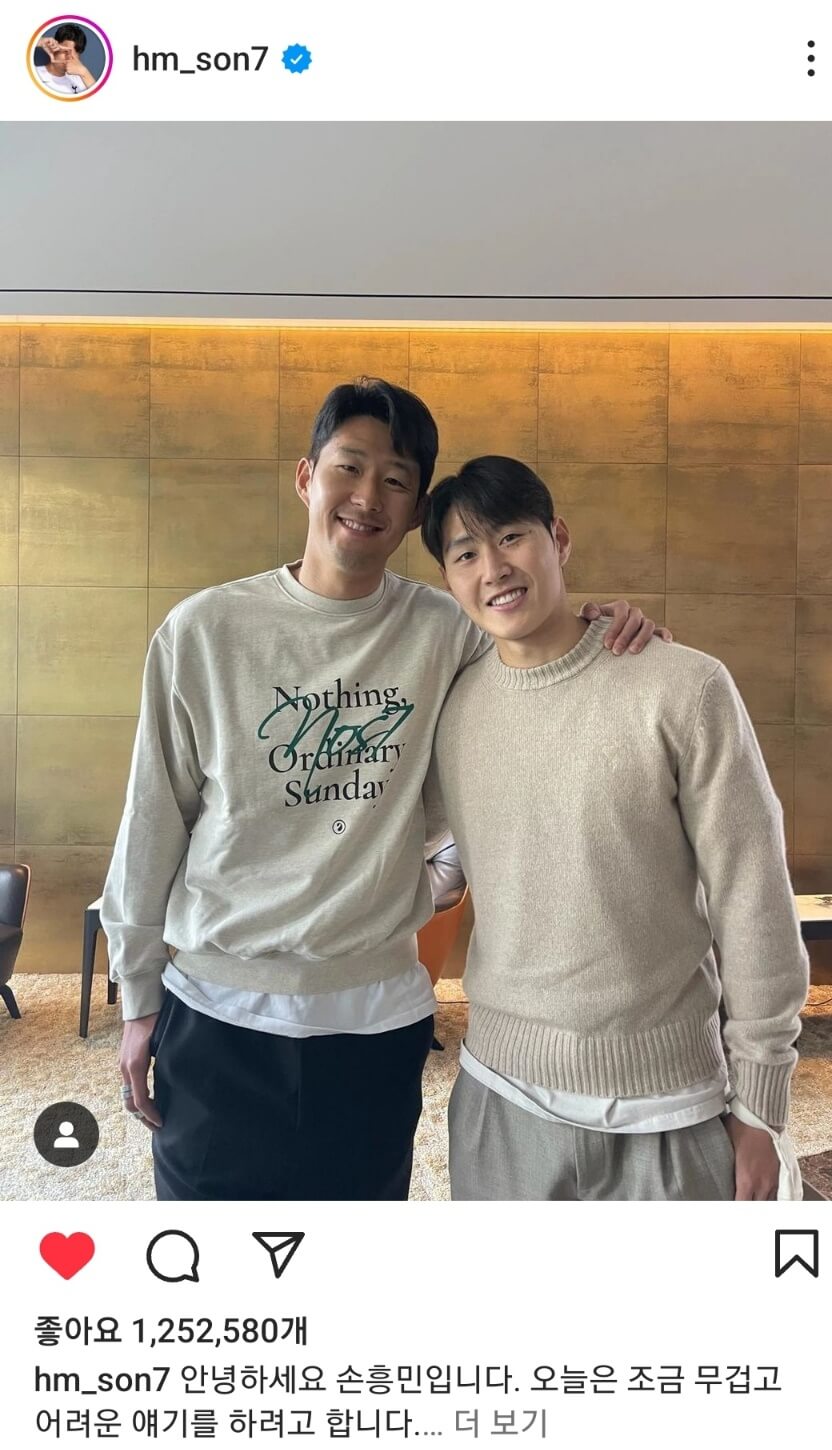 이강인의 인스타그램이 올라온 1시간쯤 후 손흥민은 인스타그램에서 이강인의 반성과 사과를 이해하고 받아주며 주장으로서의 사과문을 올리는 대인배다운 모습을 보였습니다.