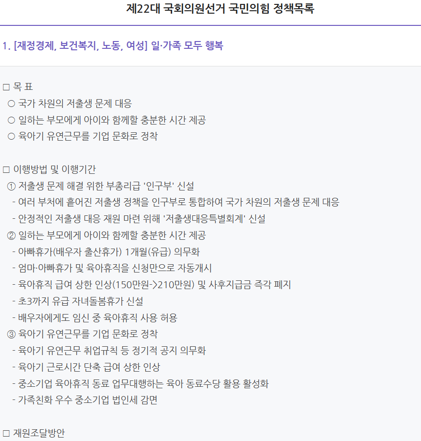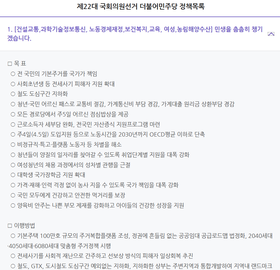 아래는 더불어민주당과 국민의힘의 정책 목록 중 일부를 캡처한 예시 이미지 입니다.