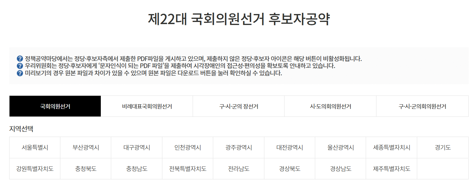 중앙선거 관리위원회 홈페이지에서는 지역별 후보자 공약을 확인할 수 있는 '정책·공약 마당' 페이지를 운영하고 있습니다. 내가 사는 곳의 후보자별 공약을 확인하고 싶으시면 '후보자정책 확인하기' 을 누르시면 내가 사는 지역을 선택하여 후보자 정책과 공약을 확인하실 수 있습니다.