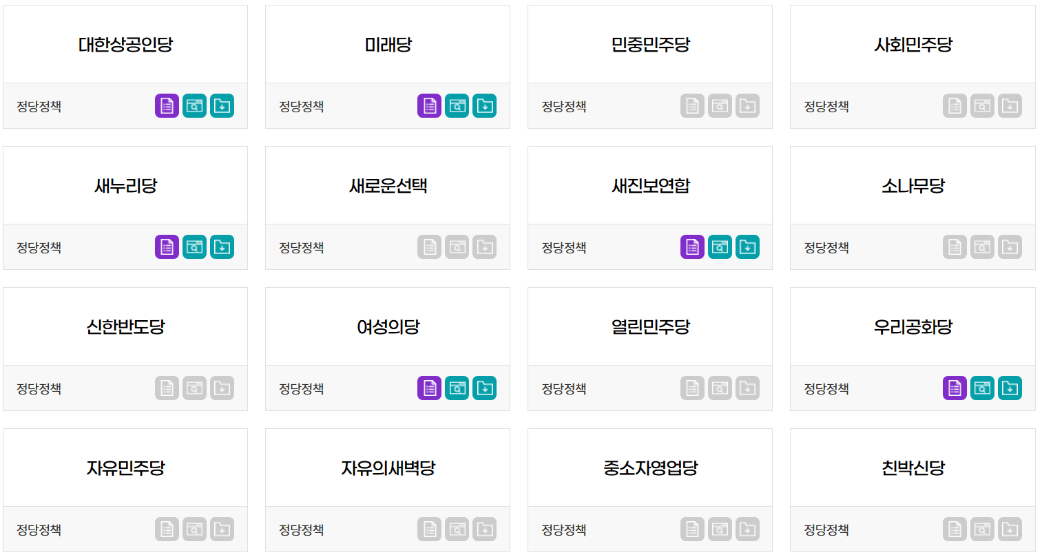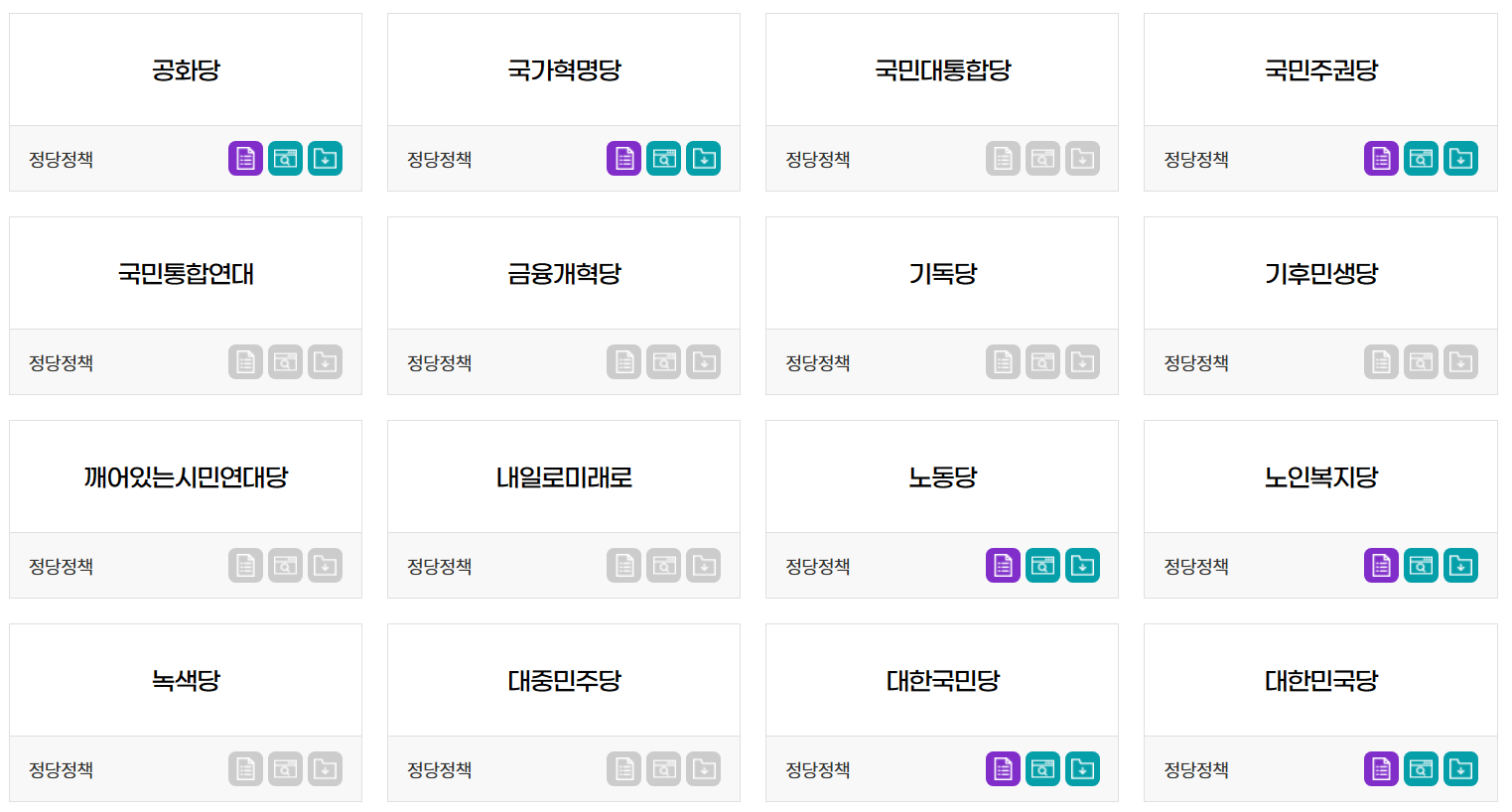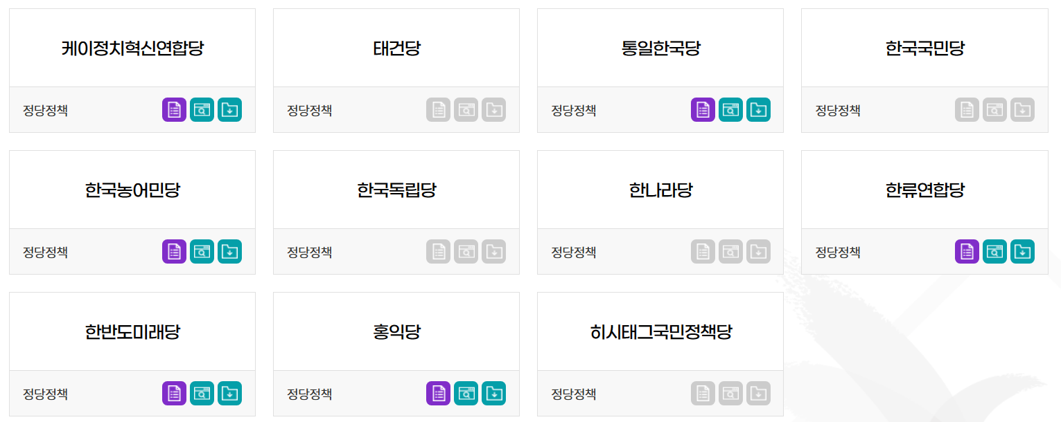 정당정책 확인하기 페이지에 있는 59개 정당중에 원하는 정당과 정책을 클릭하면 여러가지 정책 공약과 목표, 이행방법 및 기간, 재원조달방안 등이 구체적으로 기술되어 있습니다. 꼼꼼히 확인하시고 어떤 정당이 본인의 가치관과 맞는지 잘 판단해보시기 바랍니다.