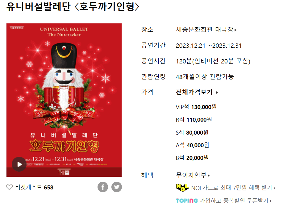현재 유니버설 발레단의 공연은 세종문화회관에서 12월 21일부터 공연될 예정으로, 남은 좌석이 많지 않아 빨리 서두르셔야 될 것 같습니다.
