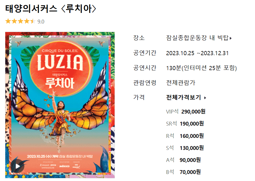 전세계 누적관객 3억명이 넘는다는 태양의 서커스가 올해에도 찾아왔습니다. 루치아는 스페인어로 빛과 비를 뜻하는 말로서, 수중과 공중을 넘나드는 환상적인 서커스와 신나는 라틴 음악이 어우러져 눈과 귀가 황홀해지는 경험을 하게 된다고 합니다. 현재 잠실종합운동장의 빅탑 공연장이 설치되어 10월 25일부터 공연이 진행되고 있으며, 수많은 공연 후기들이 만족감과 재관람의사를 표시하고 있어 공연의 높은 수준을 가늠할 수 있습니다. 크리스마스 연휴엔 남은 좌석이 많지 않으니 예매를 서두르세요!