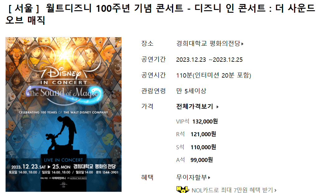 월트디즈니 100주년 기념으로 열리는 이 음악회는 80인조의 오케스트라의 선율과 초대형 스크린에서 나오는 디즈니 애니매이션 주인공들이 어우러져 월트디즈니 100년의 OST들을 감상할 수 있는 좋은 기회입니다.