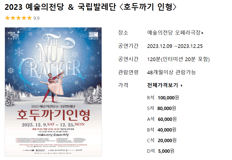 국립발레단의 공연은 예술의 전당에서 12월 9일부터 공연하고 있으며, 현재 남은 좌석이 거의 없어 빨리 알아보시거나 취소표를 노려보셔야 합니다.