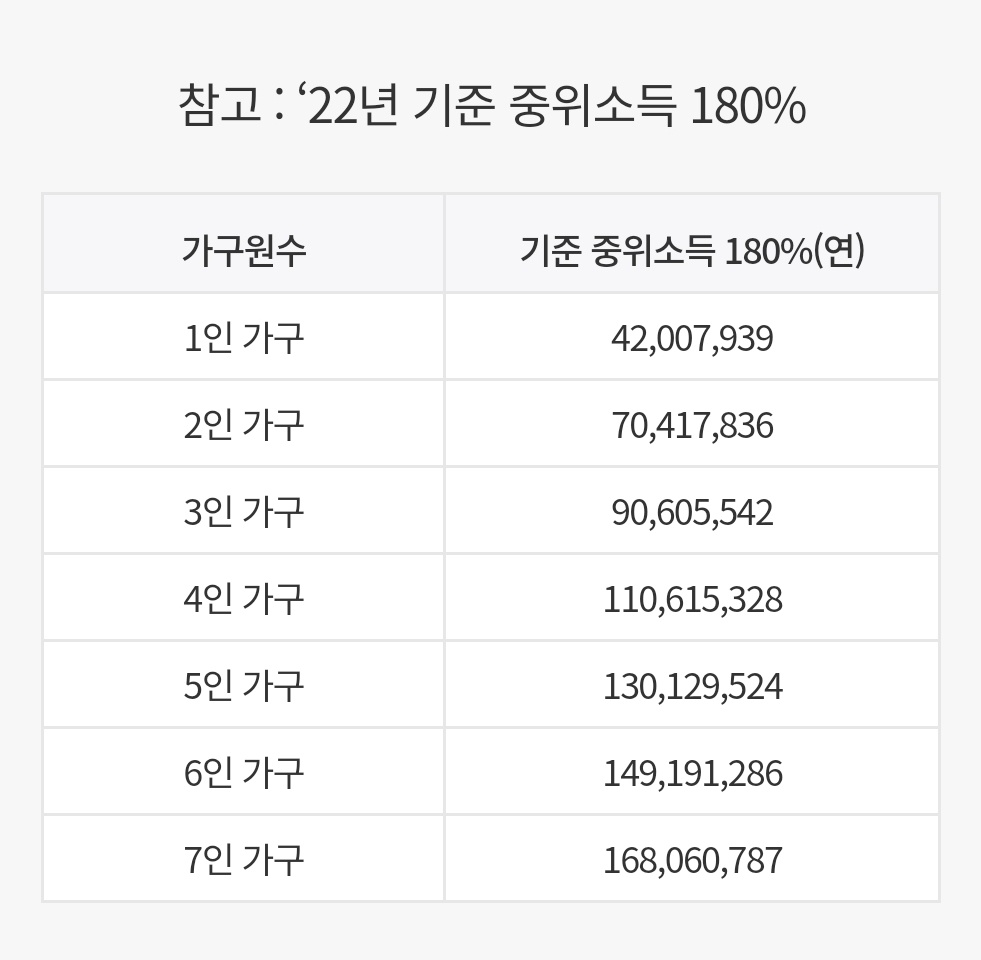 가구소득: 가구원 수에 따른 기준 중위소득 180% 이하에 해당하는 자